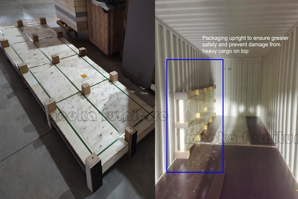 Due to this huge size and the long shipping time via sea freight as it is uploaded in containers, we have decided to make the packaging upright to ensure greater safety and prevent damage from heavy cargo on top.
