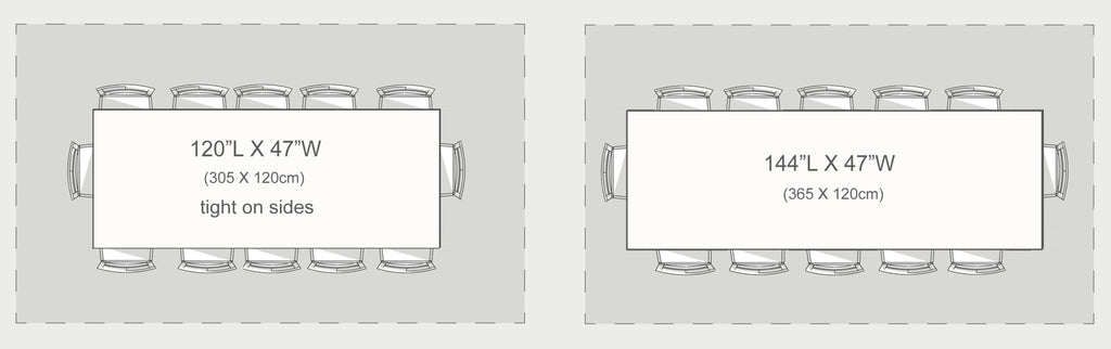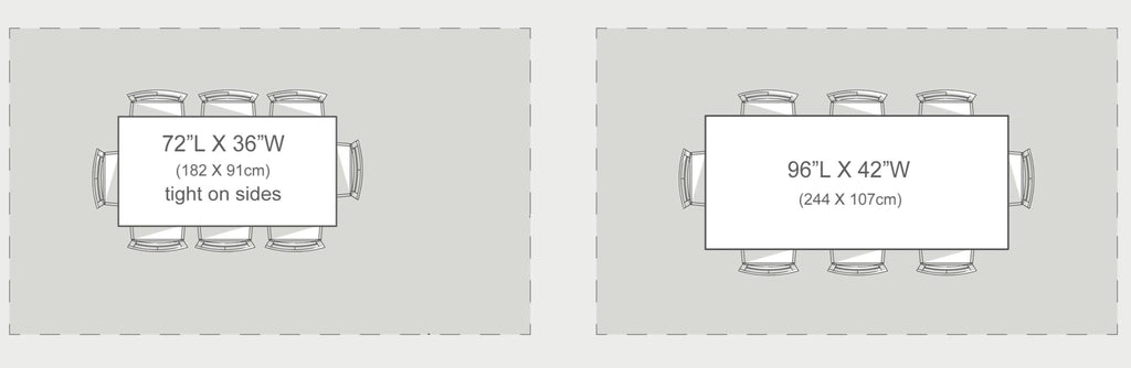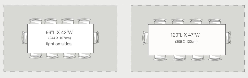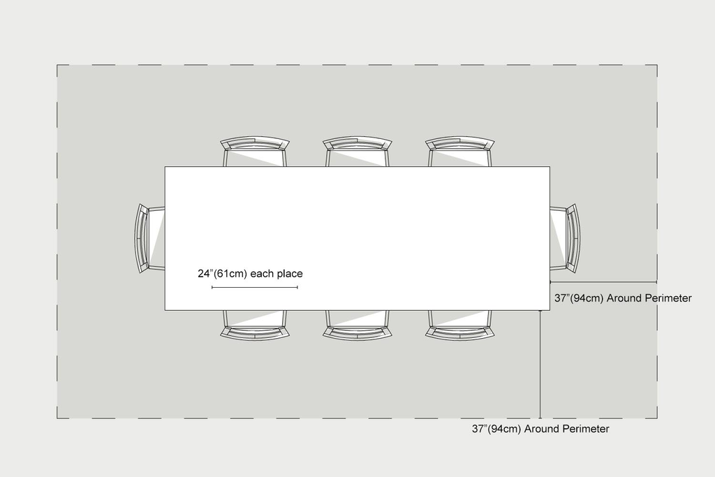 As a general rule, we tell people to give at least a space of 24”(61cm) for each place. For a more comfortable fit, 28”(71cm) would be better, or if you’re struggling you could get away with 20”(51cm) . It’s important not to forget about moving chairs in and out, for this we suggest leaving 37”(94cm) around the perimeter of any table (don’t forget to take this into account when measuring your space!)