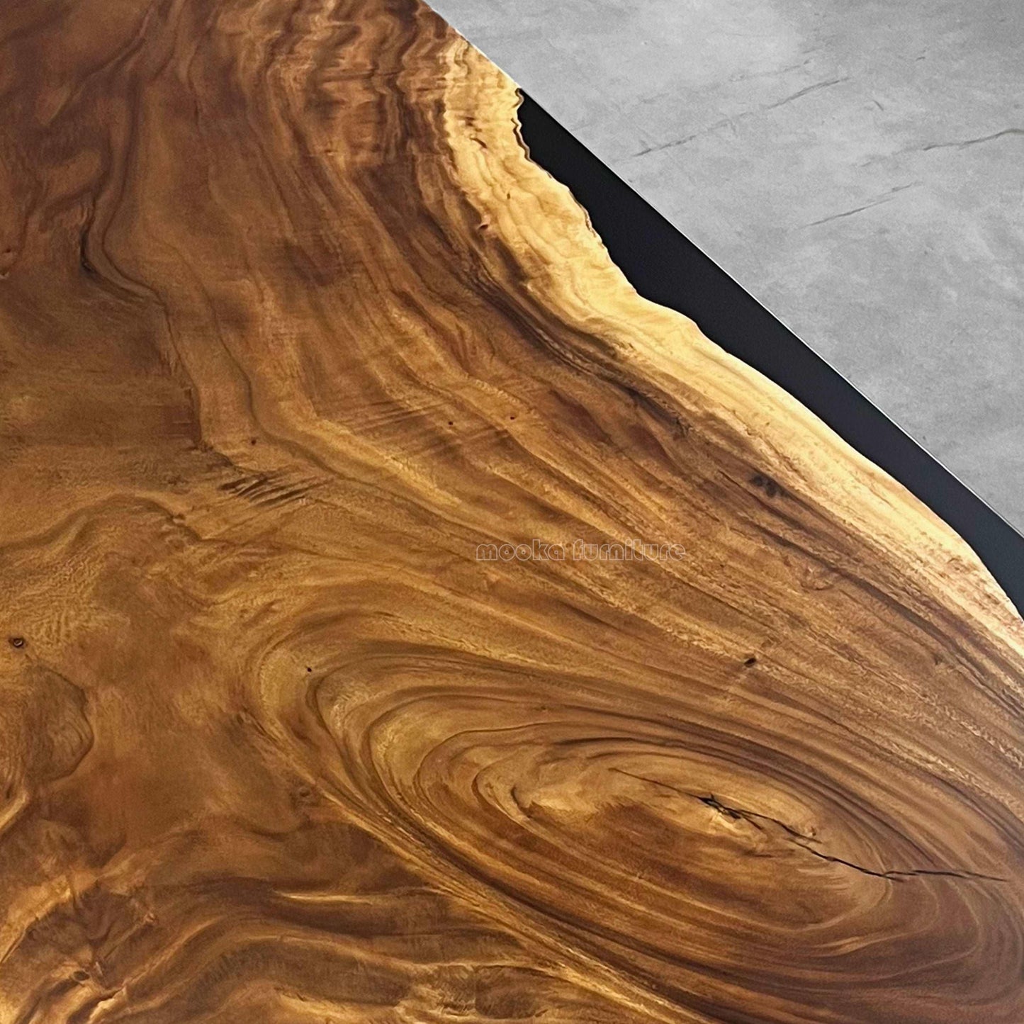 Behold this masterpiece of nature's artistry, this table is crafted from a single, awe-inspiring slab of wood. Its live edges seamlessly blend into a lustrous black epoxy resin, forming a harmonious union of natural elegance and modern sophistication. Each swirl and grain is a testament to its journey through the ages. It is a treasure of ancient forests that now graces your presence. The 87“ length comfortably accommodates three people on each side. Imagine the laughter and shared stories that will fill the room as they gather around this table, a stage for life's most cherished moments.