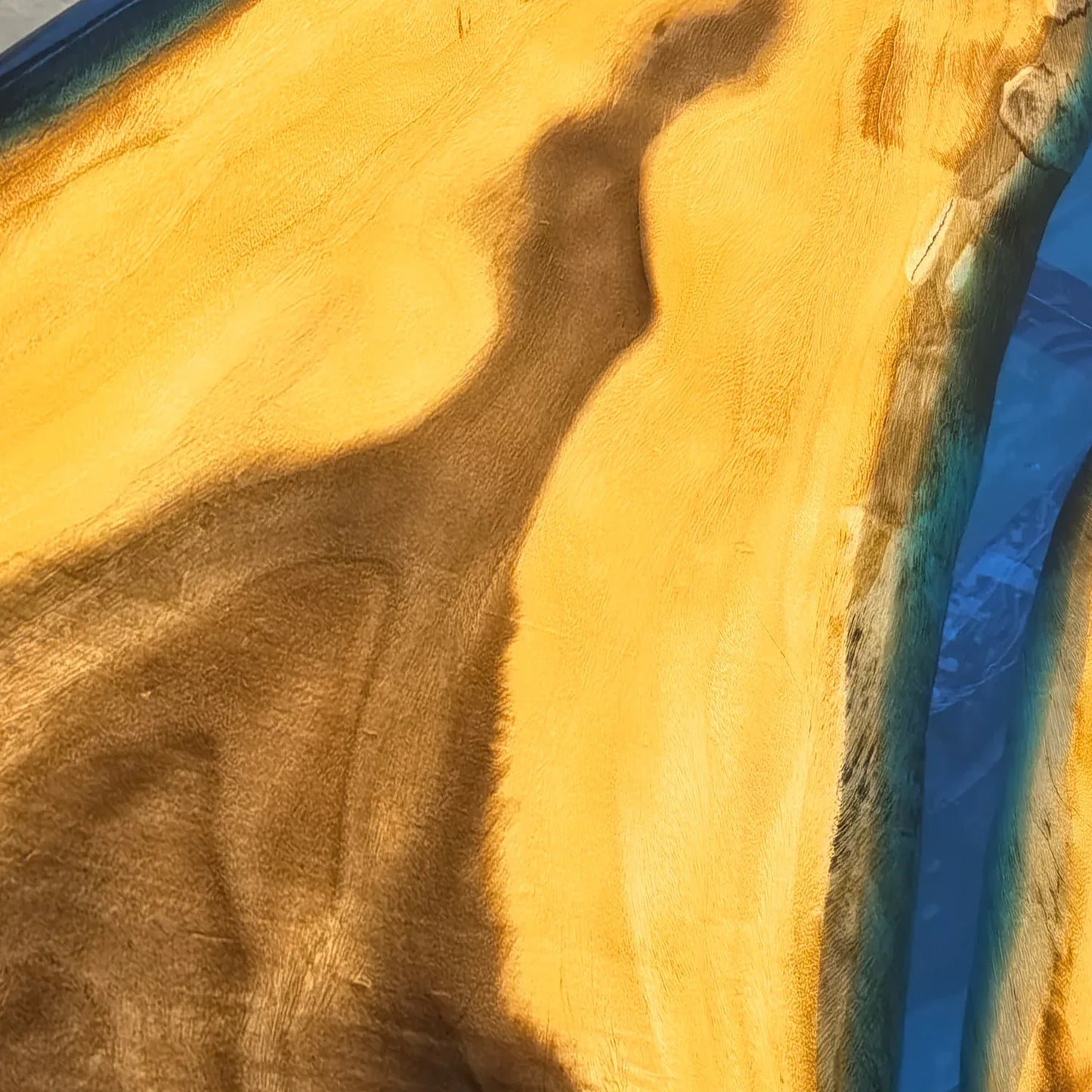 The smooth clear blue resin river flows gracefully across the wood, resembling an elegant blue ribbon that enhances the table's sophistication.Unlike other black resin rivers, through these two translucent blue rivers, you can clearly see the thickness and texture of the wood on both sides of the riverbank, making it more vibrant and captivating.This tabletop truly one-of-a-kind—there’s no other like it available online.